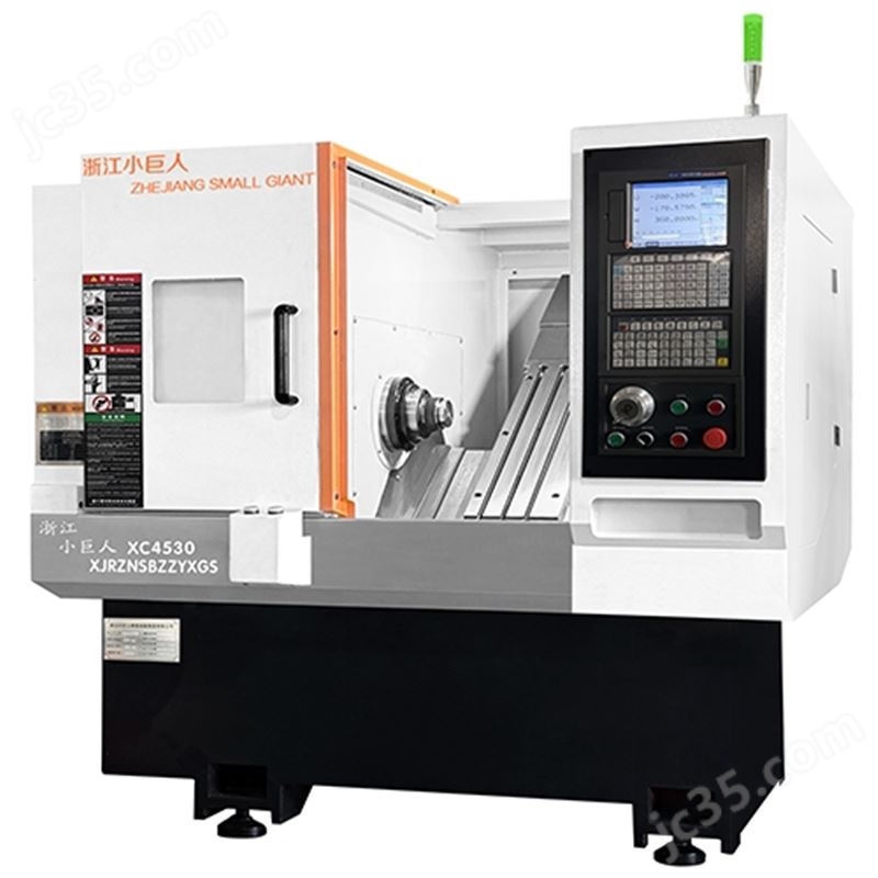 XJR-XC4530斜轨排刀机床,高精度,高性能比的机床,体积小巧,操作简便,5.5KW伺服电机,8寸卡盘,中国台湾进口丝杆导轨,35度斜床身结构,排屑更方便,机床刚性更好,排刀架上可安装多把刀具,换刀速度快,定位精准,节省换刀时间,实现高效加工,适用于中小型精密零件生产。